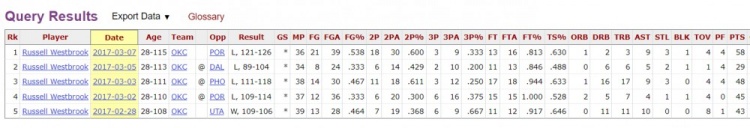 From February to March 2017, Westbrook scored 223 points in 5 games.