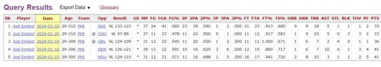 In January 2024, Embiid scored 221 points in 5 consecutive games.