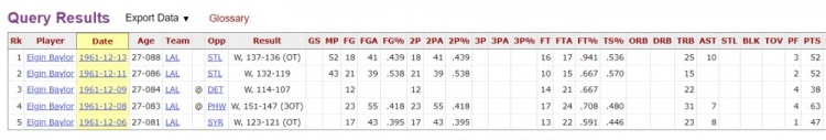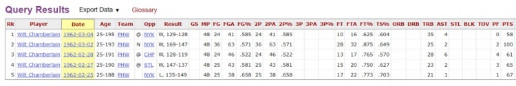 From the end of February to the beginning of March 1962, Chamberlain scored 351 points in 5 consecutive games.