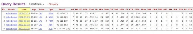 In March 2007, Kobe scored 268 points in 5 consecutive games.