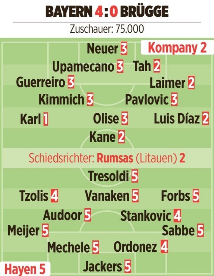 Bild scored the Bayern players in this game: Karl had the highest score, while Kane, Dias and Laimer scored high