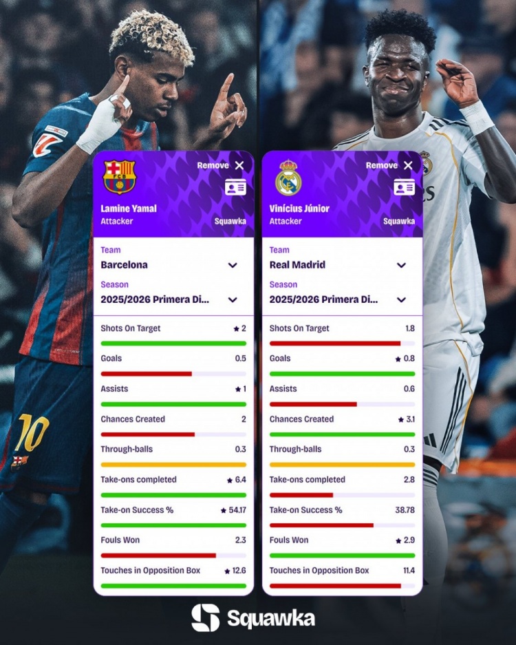 Real Madrid and Barcelona will be the focus of this round of La Liga showdown. The data agency squakwa compared the key data of Yamal and Vinicius in La Liga in the 2025/26 season (bold items are advantageous data):