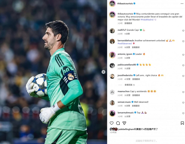 Courtois assisted in this game and wore a captain's armband. After the game, he also posted a photo on social media and wrote: "We won a wonderful victory with our outstanding performance. I am very excited to be able to wear the captain's armband of the best club in the world."