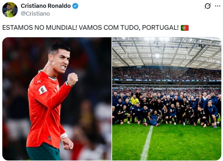 Cristiano Ronaldo posted a team photo on social media to celebrate: We have qualified for the World Cup! Come on, Portugal!