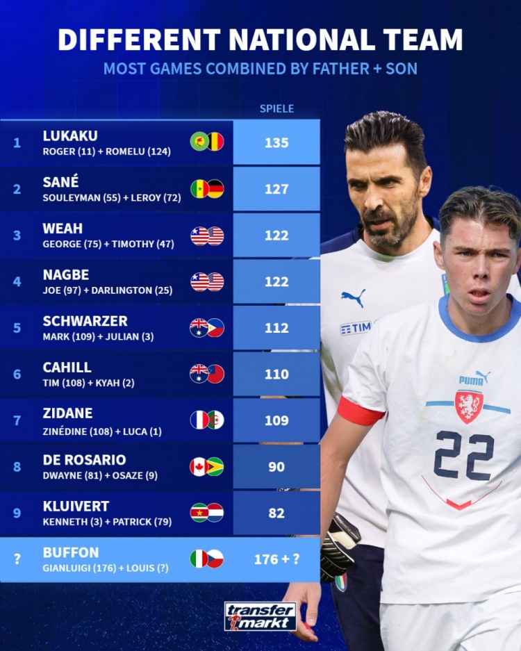 The German transfer market has compiled statistics on the number of appearances played by football fathers and sons on behalf of different national teams and listed the list. Buffon's son Louis Buffon has played for the Czech U19 youth team twice in one week and is expected to be selected for the Czech adult team. Therefore, the German transfer market has also included Buffon and his son on the list in advance.