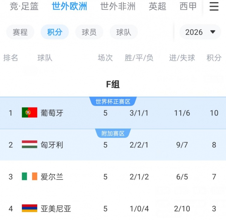 The current points situation of Group F in the European Group Stage of the World Cup Qualifiers is as follows: