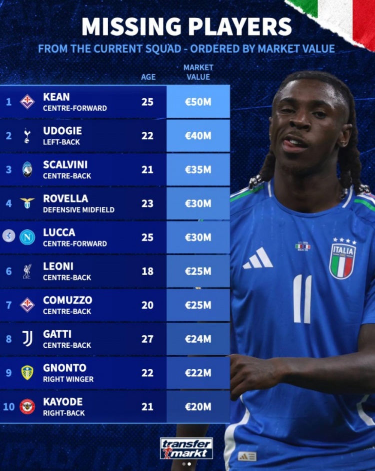 List of players who are absent from the Italian team in this issue: Keane leads the list with 50 million euros, Udoji second