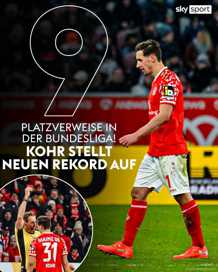 Mainz defender Cole was shown a red card for the 9th time in the Bundesliga, becoming the player with the most red cards in Bundesliga history.
