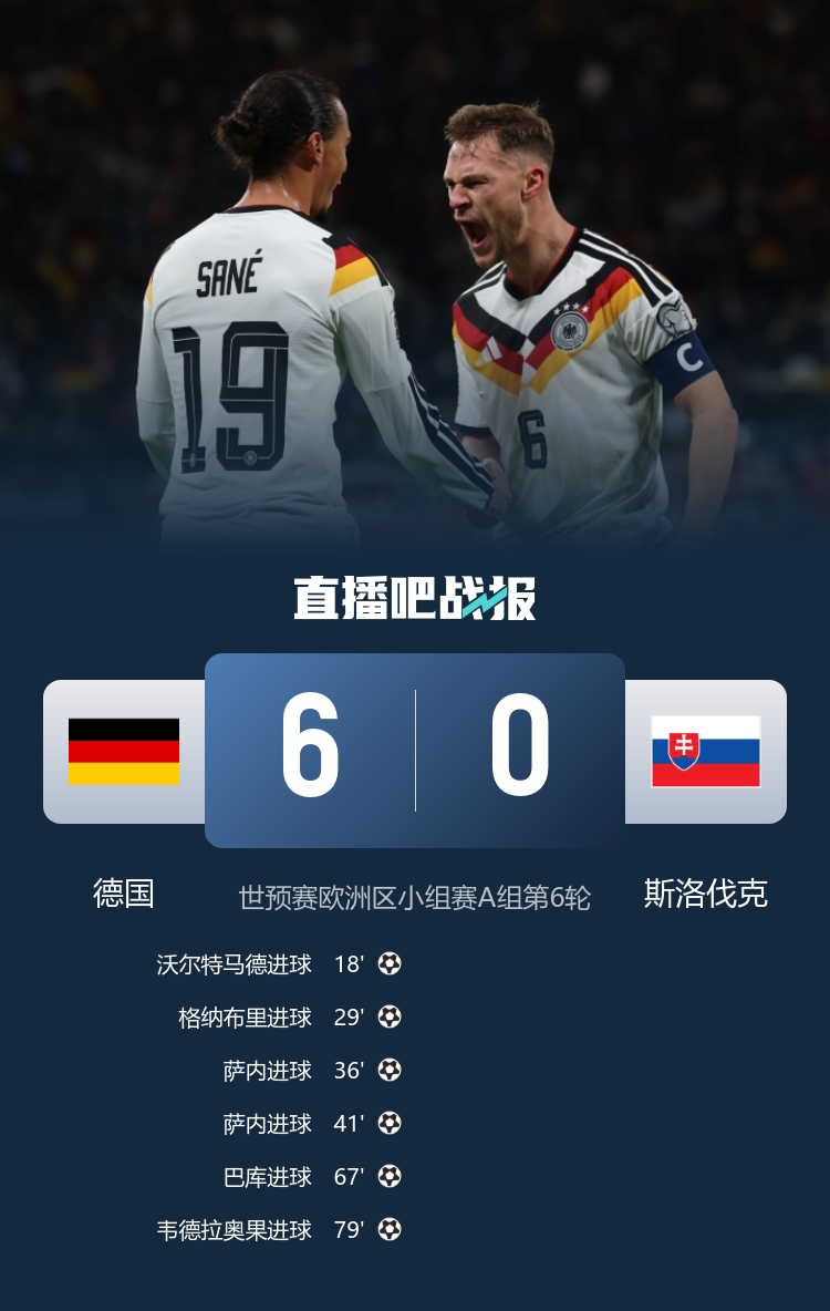 Enter the World Cup! Germany swept Slovakia 6-0. Wirtz assisted Sane twice and Gnabry passed the ball