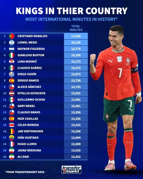 The German transfer market lists the national team's playing time rankings, with Cristiano Ronaldo ranking first and Messi second.