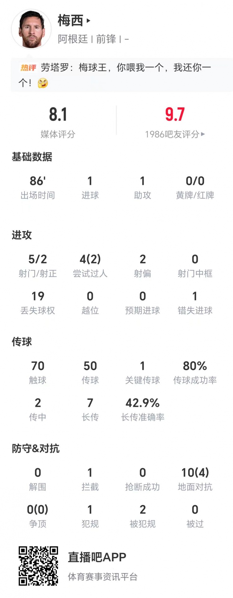 Technical statistics show that in this game, Messi had 5 shots on goal and two on target, scored 1 goal and sent 1 assist, succeeded twice in 4 dribbles, made 1 key pass, and succeeded in 4 out of 10 ground duels, and was rated 8.1 points.