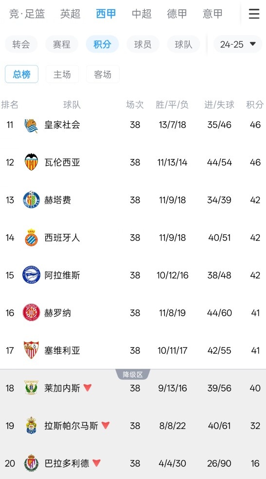 And in last season, Sevilla's situation was very different. Throughout the season, they had 10 wins, 11 draws and 17 losses, and finally scored 41 points, successfully relegated by only 1 point.